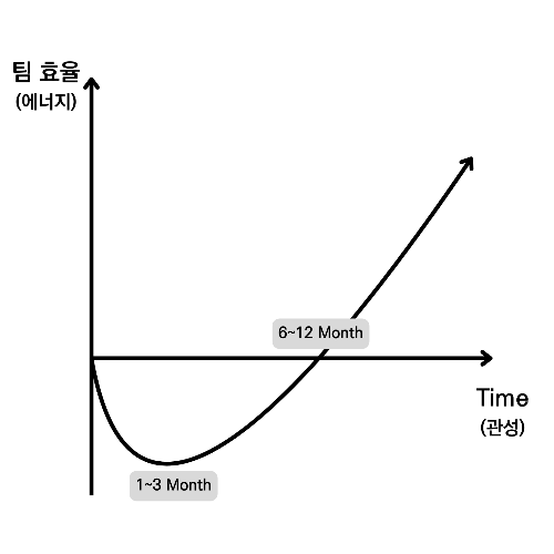 위 '[그림 1]'은 신규 팀원(직원 포함)이 팀에 들어와 인수인계를 받으면서, 팀 효율에 기여하는 시점을 나타낸 그래프이다. 이것은 신규 직원이 바로 투입되었다고 해서 팀 효율에 기여되는 게 아니라는 것을 알 수 있다. 적어도 1~2개월 이상은 적응 기간이 필요하며, 팀에 도움이 되기까지 최소 6개월 이상 소요됨을 알 수 있다. 그렇다. 이러한 사유로 인해, 신입직원은 통상 3개월의 인턴기간, 경력직은 1개월이라는 수식이 붙지 않았던가?